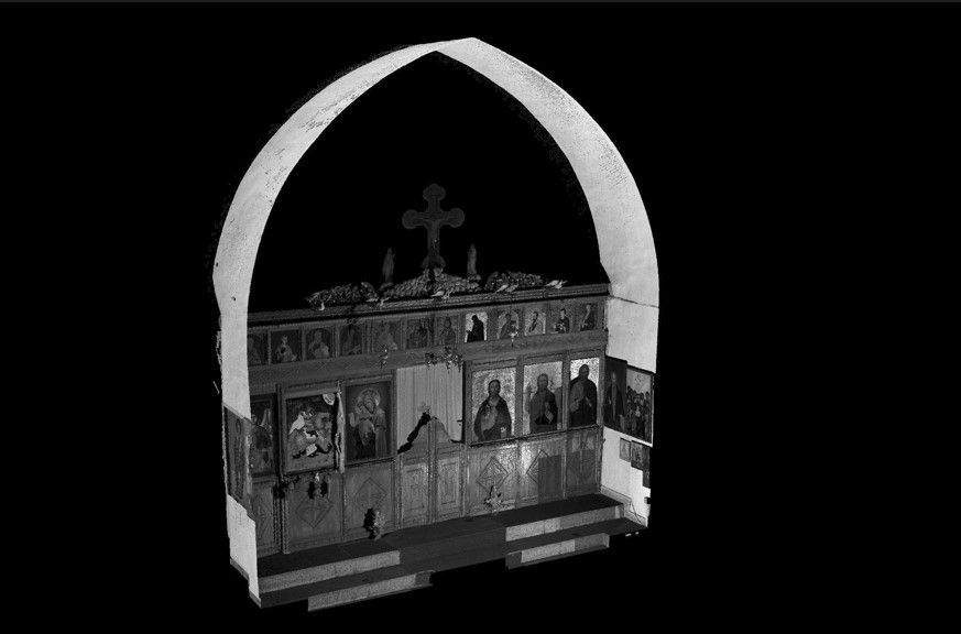 The 3D Survey covered not only the iconostasis but also the church’s interior and exterior architecture. Using terrestrial laser scanning (TLS), a detailed digital record was produced to support both artistic reinterpretation and future conservation efforts. The deliverables included a highly accurate 3D point cloud model as well as a mesh model, both enabling detailed visualization and interaction.